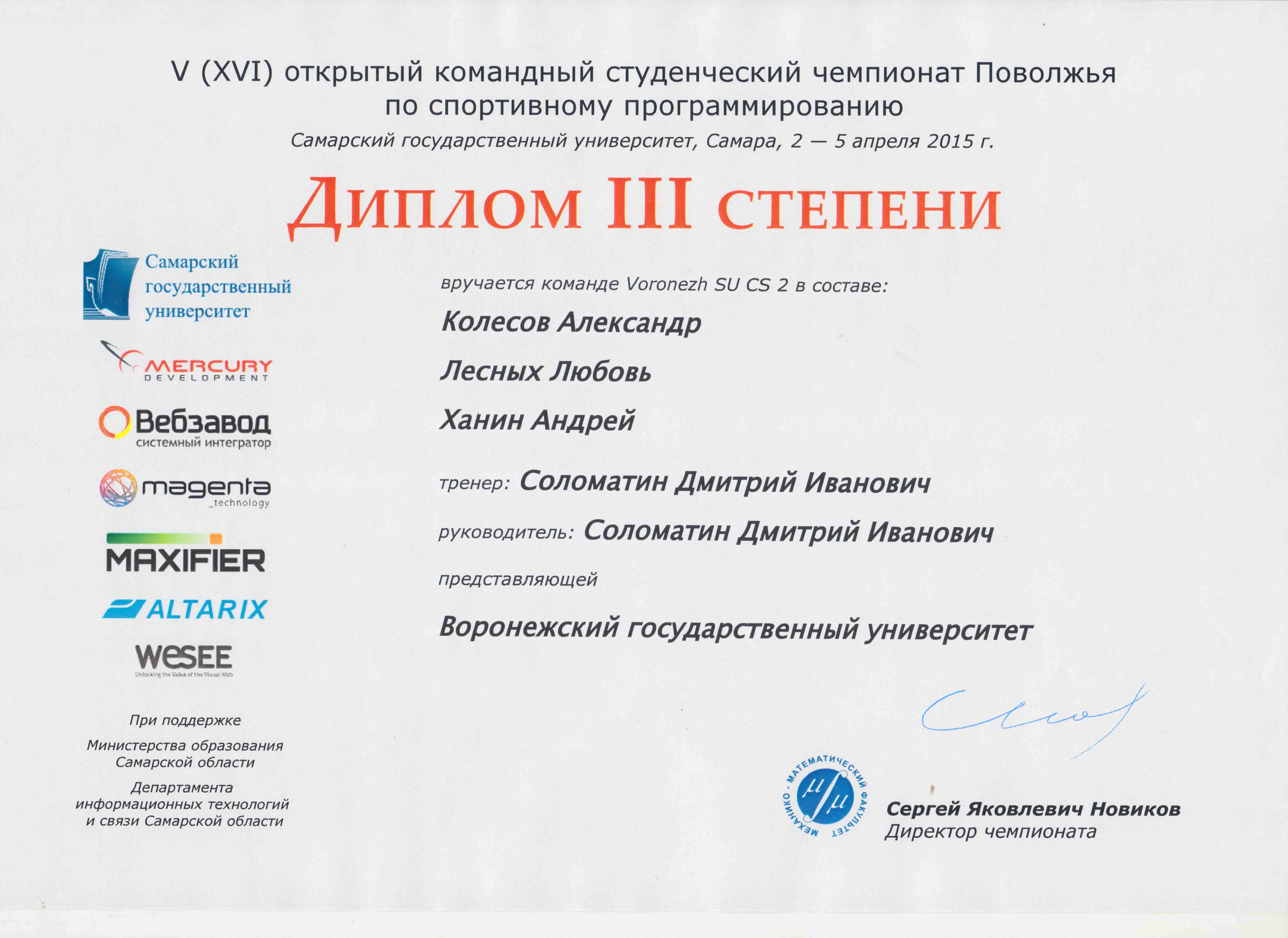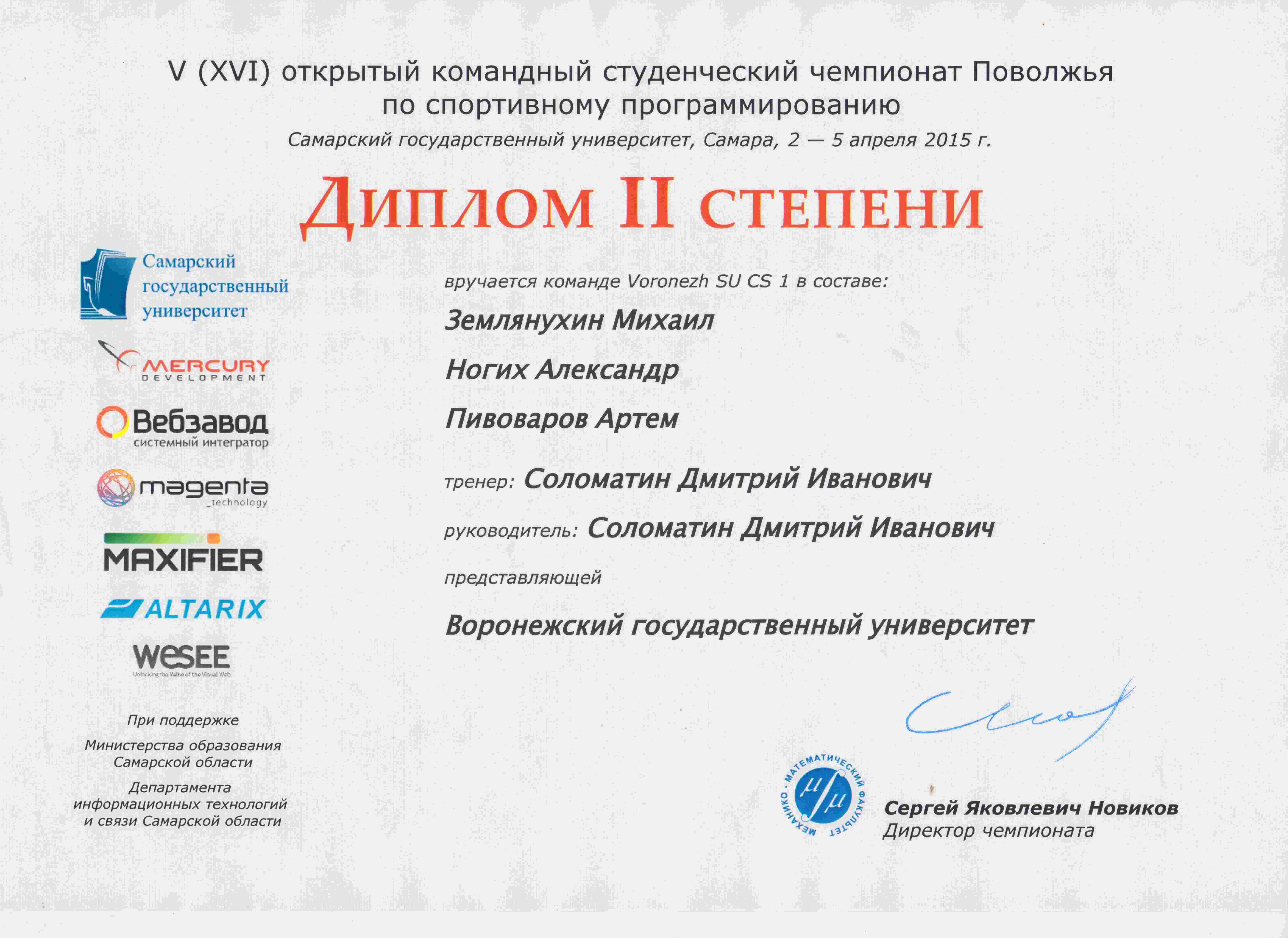 2–5 апреля в Самарском государственном университете состоялся V (XVI) Открытый командный студенческий чемпионат Поволжья по спортивному программированию, в котором приняли участие 68 команд из вузов Центральной России, Поволжья и Урала. Наш факультет представляли две команды: CS1 в составе: Землянухин Михаил, Ногих Александр и Пивоваров Артем; CS2 в составе: Колесов Александр, Лесных Любовь, Ханин Андрей. Руководитель и тренер наших команд — старший преподаватель кафедры ПиИТ Соломатин Дмитрий Иванович. Обе команды стали призерами чемпионата: команда CS1 награждена дипломом II степени, CS2 — дипломом III степени. Поздравляем ребят и их тренера с заслуженным успехом!