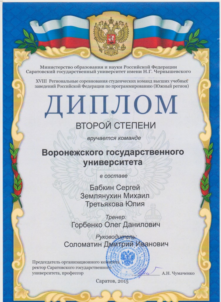 команда в составе магистранта факультета ПММ Сергея Бабкина, студента факультета компьютерных наук Михаила Землянухина, магистранта факультета ПММ Юлии Третьяковой награждена Дипломом II степени и вышла в полуфинал Чемпионата мира.