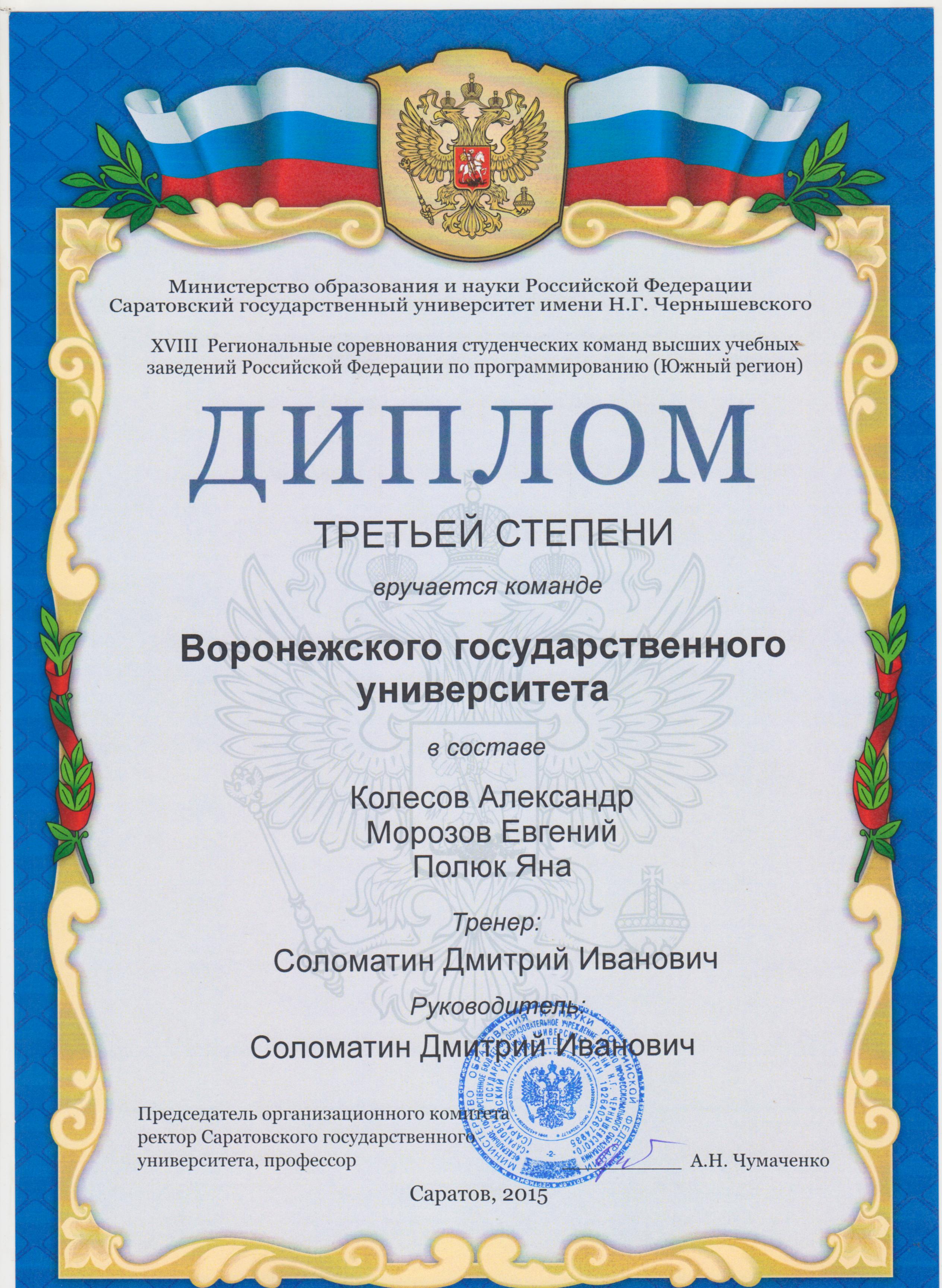 команда в составе магистрантов факультета ПММ Сергея Минаева, Анны Скобаневой и Николая Перунова завоевала Диплом III степени